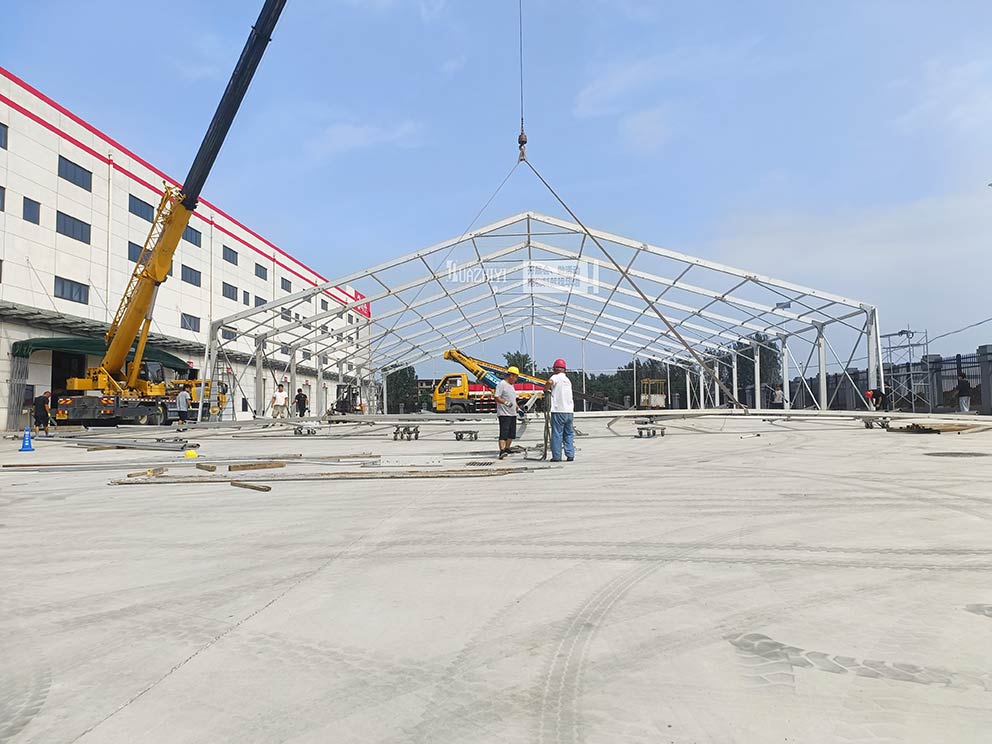 以鄭州華熠篷房租賃公司為例,我們擁有搭建團隊和豐富的搭建經驗。在人員和設備充足的情況下,一天內搭建好一座千平方米的篷房并非難事。這些篷房搭建過程簡單快捷,無需復雜的審批手續,且對地面沒有特殊要求,進一步縮短了搭建周期。