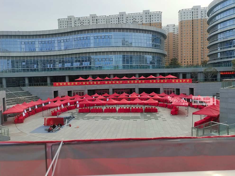 鄭州帳篷廠家助力金水區退役軍人招聘會搭建數頂紅色簡易帳篷。在華熠優質的帳篷產品和服務下,預祝招聘會順利舉行!