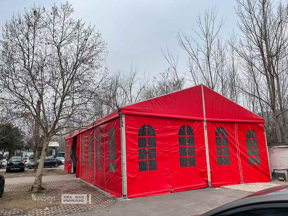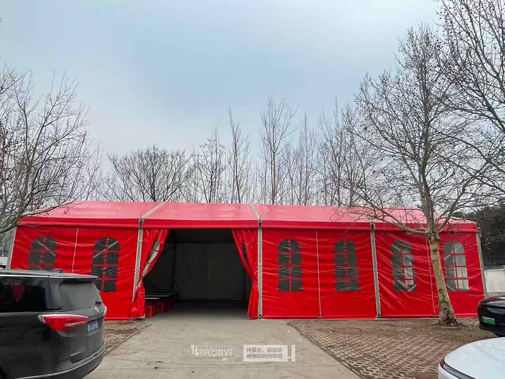 周口篷房出租選用高品質紅色篷布,色澤鮮亮飽滿、不易褪色,熱烈的紅色自帶喜慶氛圍,既適配婚宴、節慶等喜慶場景,也能為展會、團建等活動增添活力,與戶外環境相得益彰。篷房采用高強度鋁合金框架,結構穩固、抗風防雨,密封性能優異,可有效遮擋烈日、抵御風雨,為用餐人員打造舒適、安全的用餐環境。